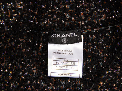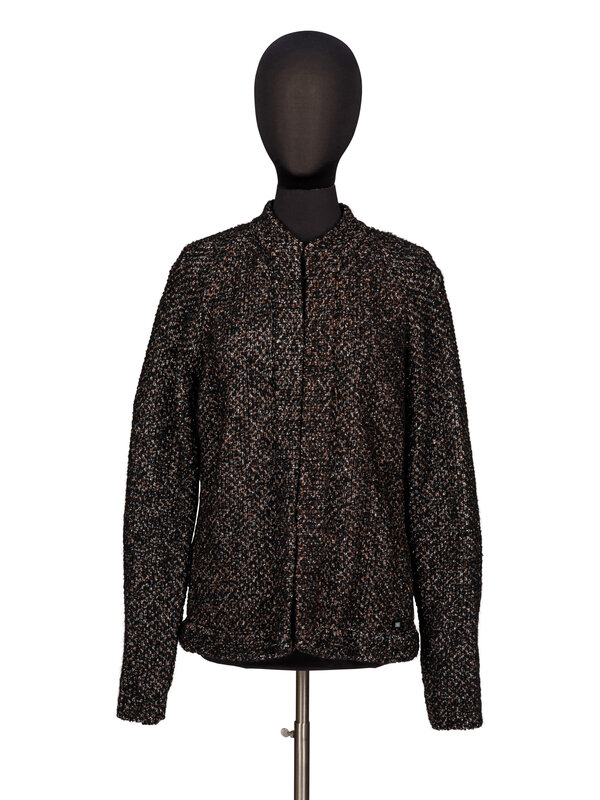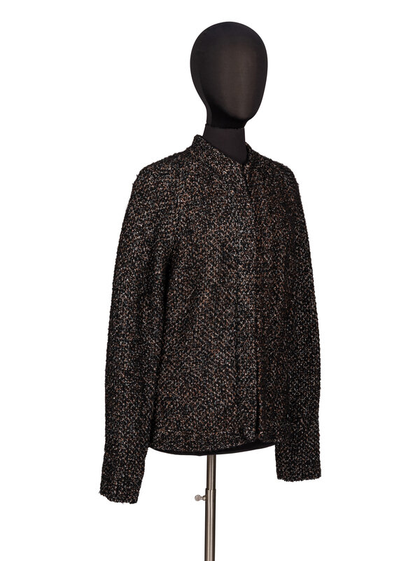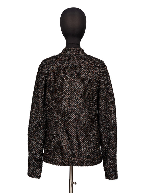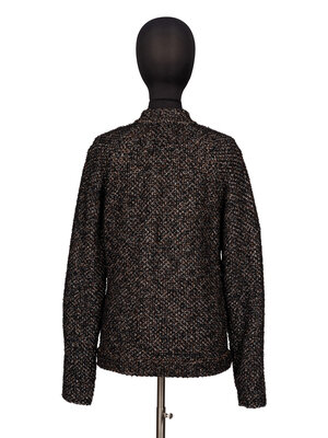 Cardigan in black alpaca/wool-blend knit; features metallic silver threads throughout. Round neckline. Full-length raglan sleeves. Six hook-and-eye closures at front. Unlined.