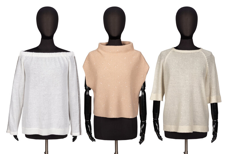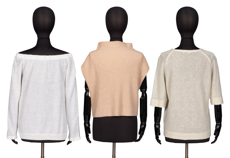Sweater in white linen/silk-blend knit with incorporated clear sequins throughout. Wide bateau, off-shoulder neckline with elastic around neckline edge. Raglan sleeves with two strips of silver-tone monili bead trim down the center of both sleeves. Unlined.