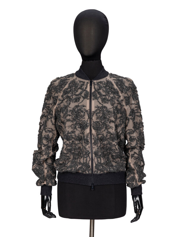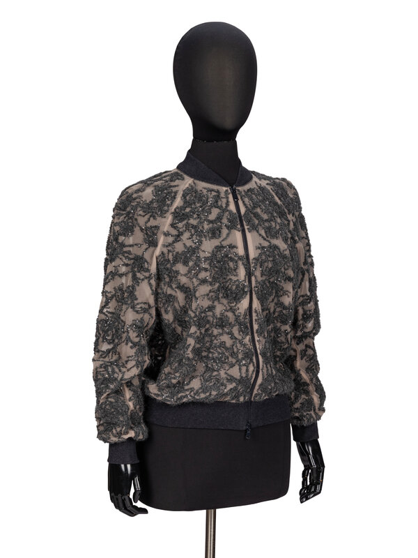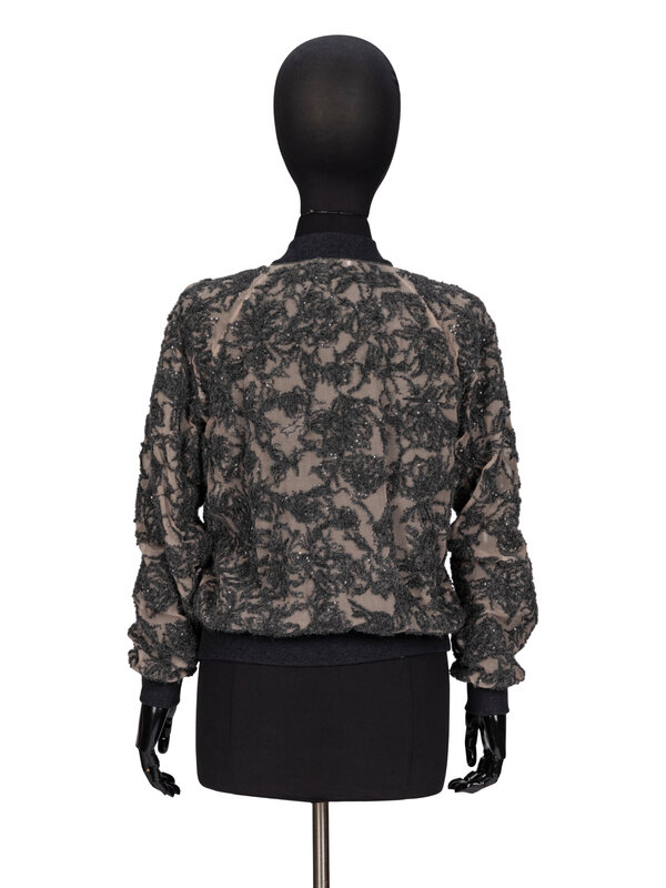 Bomber jacket in beige silk chiffon with all-over grey mohair-blend yarn & sequin appliqués; dark grey cotton-blend ribbing at hem, sleeve hems, and around neckline. Double-ended zipper closure at front. Unlined.