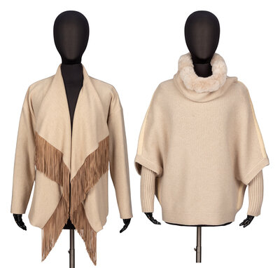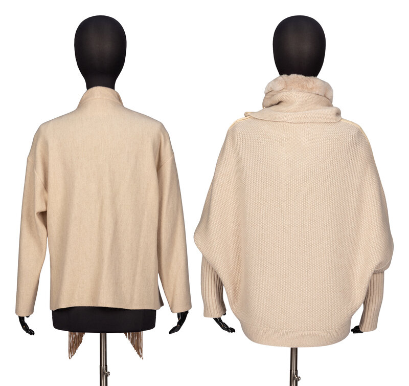 one knit poncho sweater in beige cashmere with beige suede trim, hidden snap closures at left shoulder seam; one detached turtleneck collar in beige cashmere knit with chinchilla fur and beige suede trim, snap closures along one side; two arm warmers with thumb holes in beige cashmere knit.