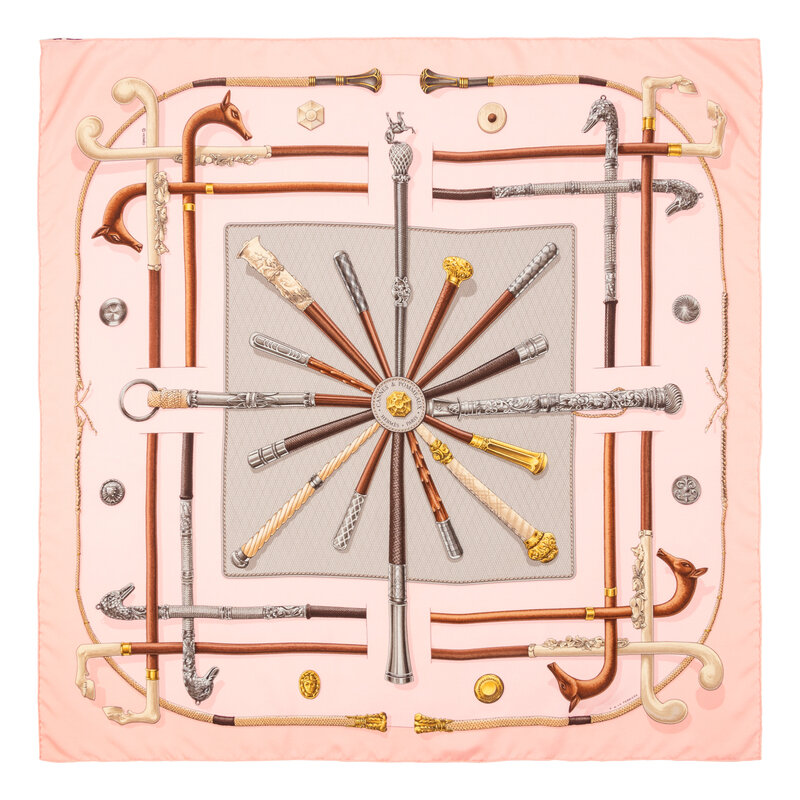 "Cannes & Pommeaux" Scarf SIZE in printed silk twill. Features rolled and hand-stitched edges.