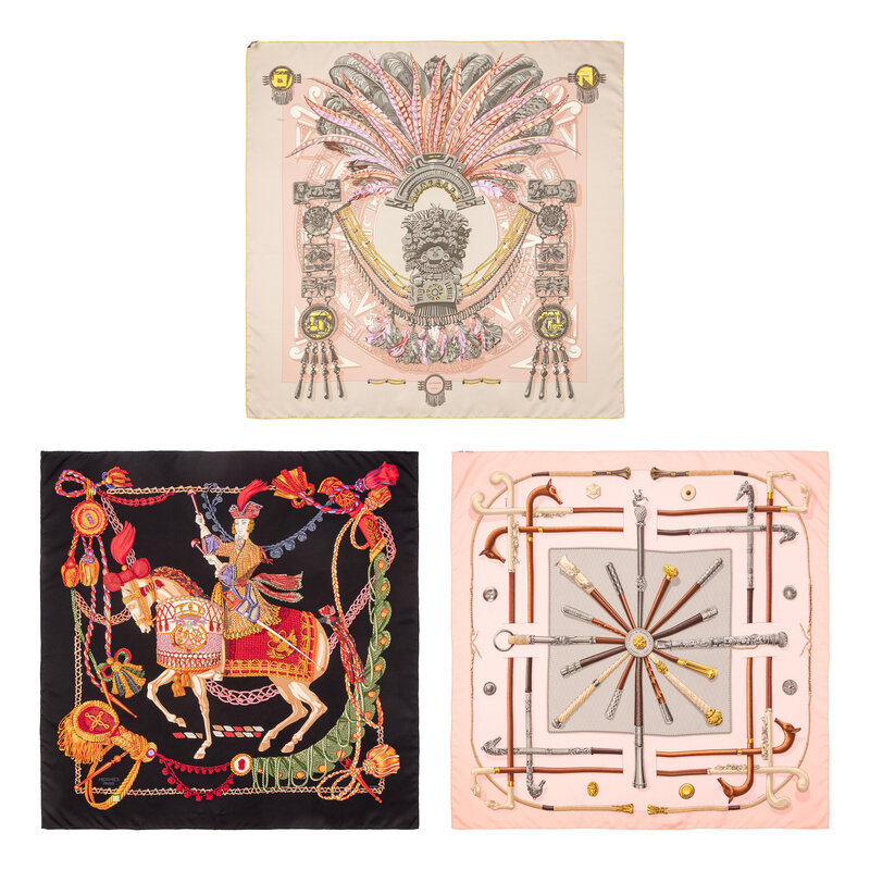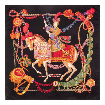 "Le Timbalier" Scarf 90 in printed silk twill. Features rolled and hand-stitched edges. Includes box.