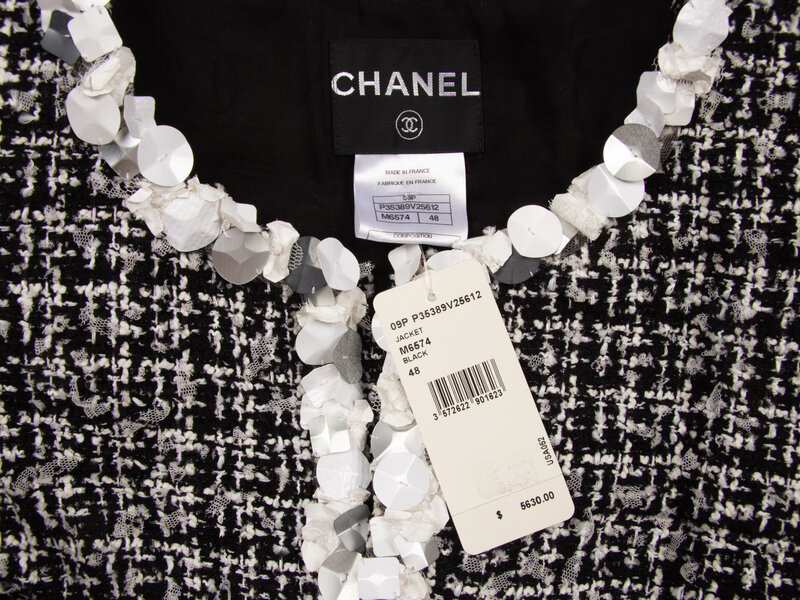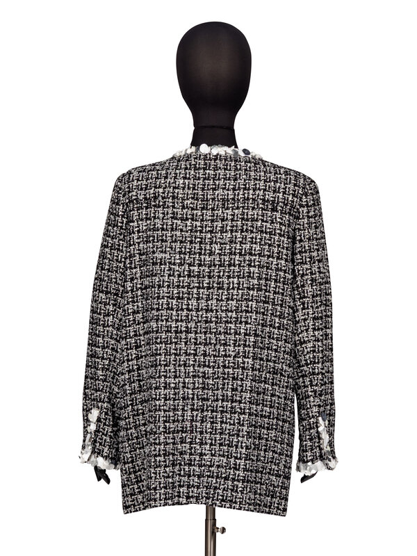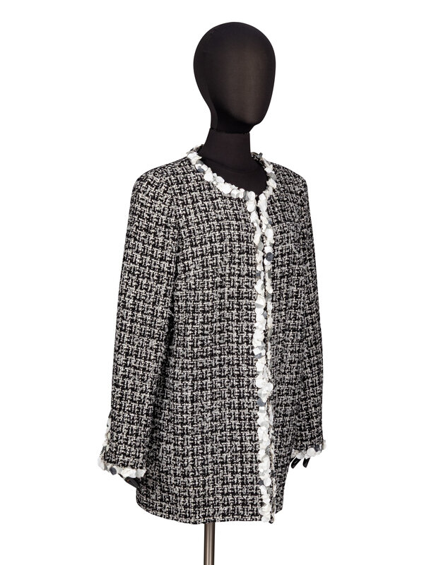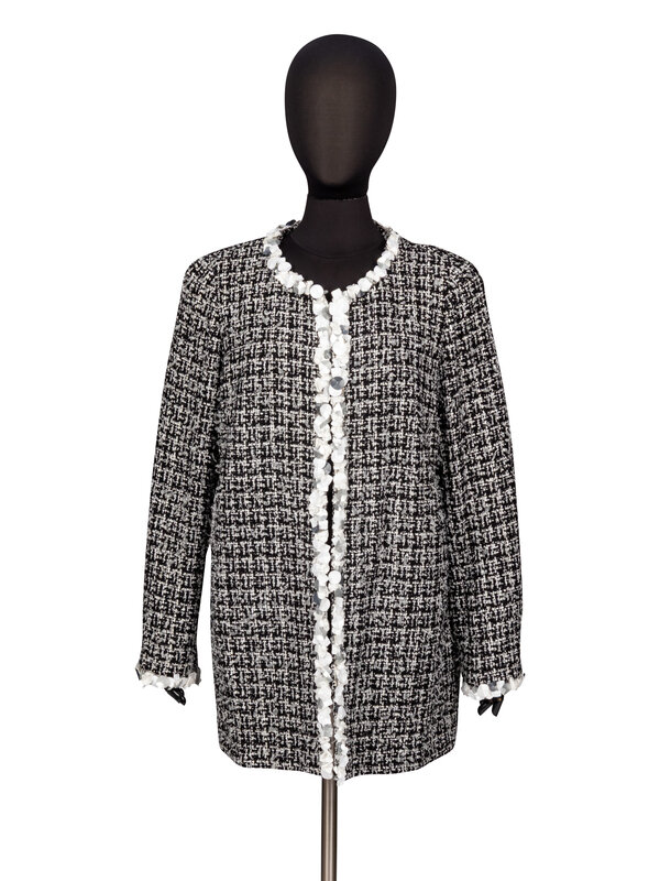 Long cardigan jacket in black & white fantasy tweed. Round collarless neckline. Light padding at shoulders. Wrist-length set-in sleeves with working three button closures at sleeve hems. Oversize grey & white sequin trim throughout. Two in-seam pockets at sides. No closures. Partially lined.