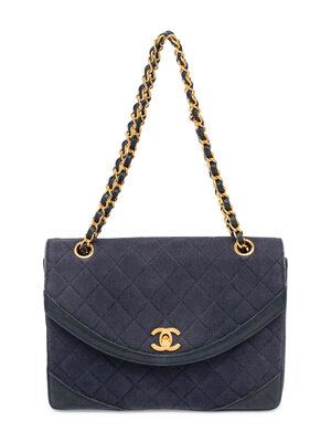 Chanel flap bag in quilted navy blue canvas and navy blue calfskin leather with 24k gold-plated hardware. CC turn-lock closure and interwoven leather-metal chain strap.