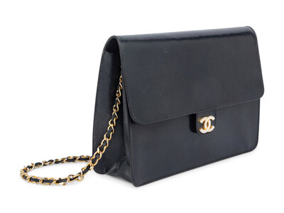 Chanel square flap bag in smooth black calfskin leather with gold-tone hardware. Snap closure and interwoven leather-metal chain strap.