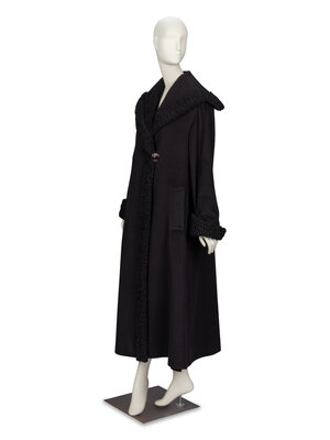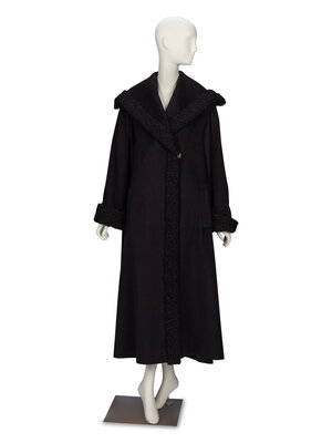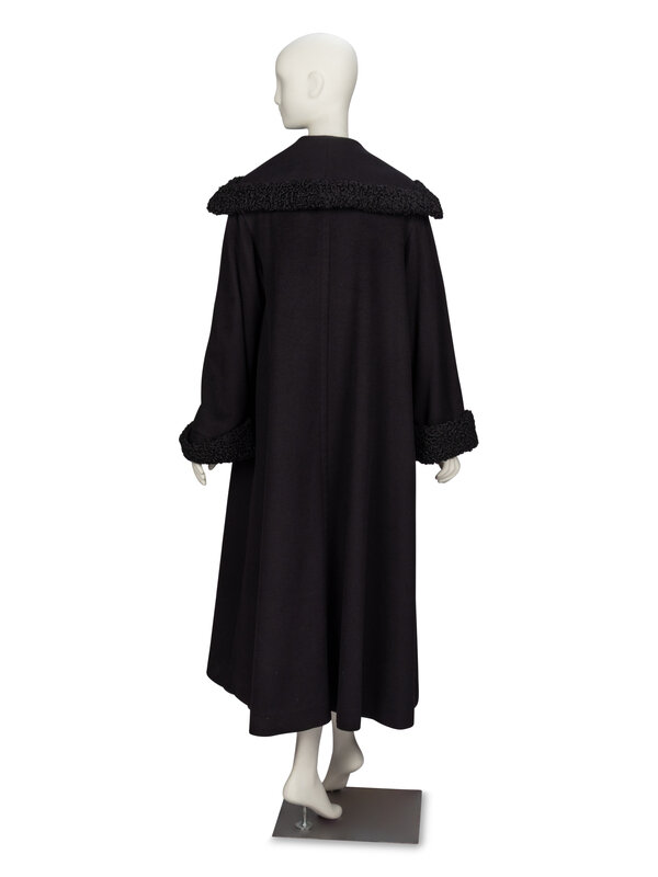 Ankle-length A-line coat in black cashmere-blend wool coating; with black Astrakhan fur trim around collar, front edges, and at cuffs. Sailor-style collar. Full-length set-in sleeves with turned-up cuffs. Two welt pockets at front. Single button closure at front. Fully lined.