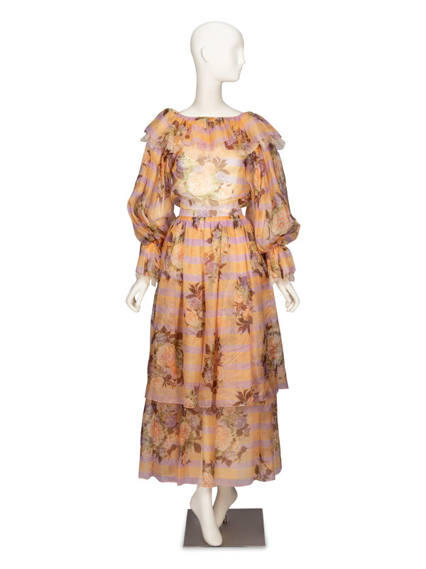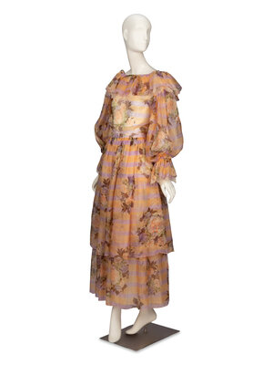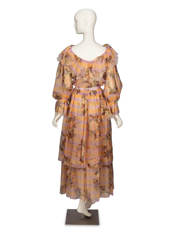 Dress ensemble in multicolor pastel striped & floral-printed organza. Wide-neck blouse with ruffle collar; full-length bishop sleeves with elasticated cuffs; and lace trim throughout. No closures & unlined. Ankle-length two-tier skirt with hook-and-eye closures at back; self- & organza-lined.