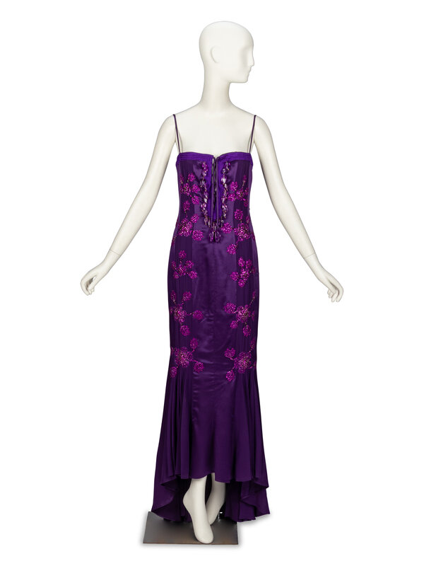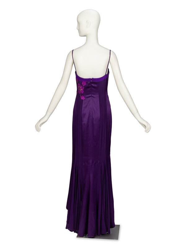 Evening gown in paneled purple satin & chiffon; with purple rhinestone embellishments and passementerie trim throughout. Large translucent purple bead details and ties with laced cutout at front bodice. Square neckline. Sleeveless with spaghetti straps. Boned corselette at interior with underwire supports. Flared silhouette with high-low hemline. Invisible zipper closure at back. Partially lined.