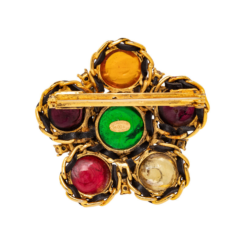 Brooch in gold-tone metal with multicolor Gripoix pâte de verre cabochons, strass studs, and woven leather elements. Standard pin backing. Stamped "CHANEL / 96 A / MADE IN FRANCE" at back.