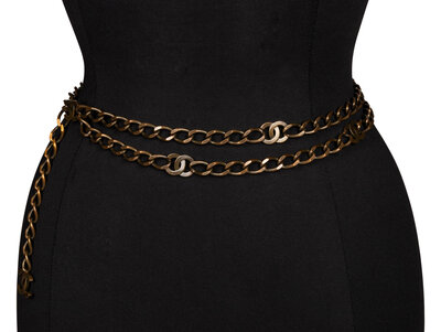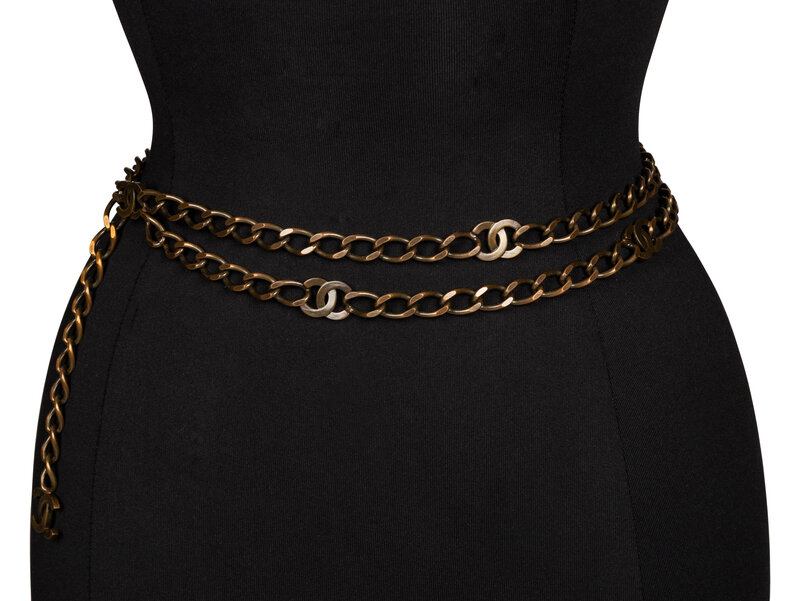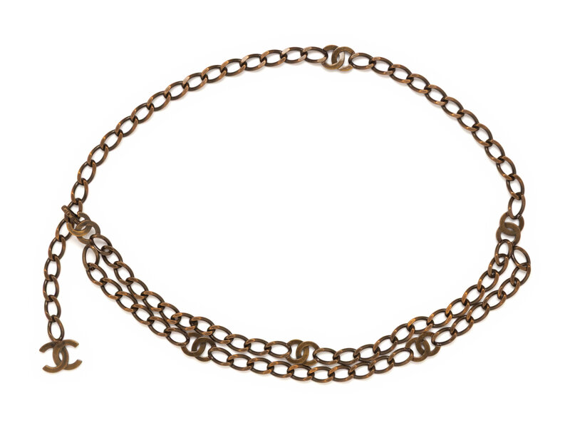 Adjustable length chain-link belt in aged bronze metal. Features CC logos throughout; dangling CC charm at end.