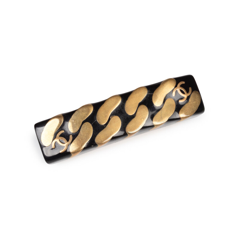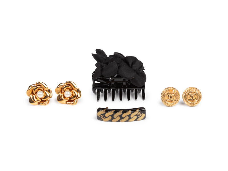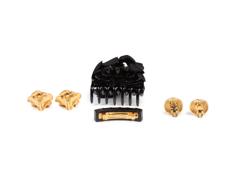 Claw clip in black plastic with black silk camellia flowers attached at top. Stamped "CHANEL / MADE IN FRANCE" at hang tag at back of flower.