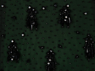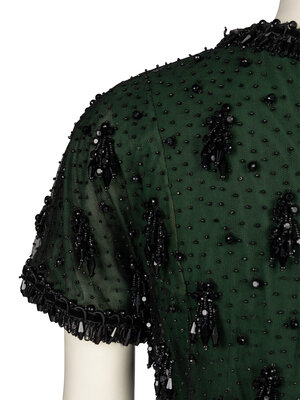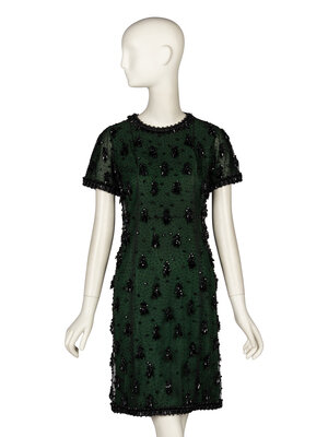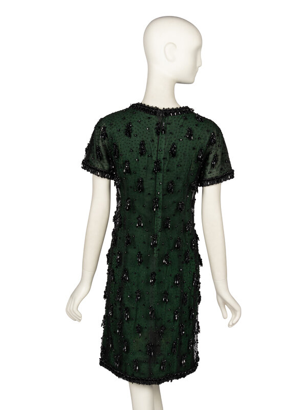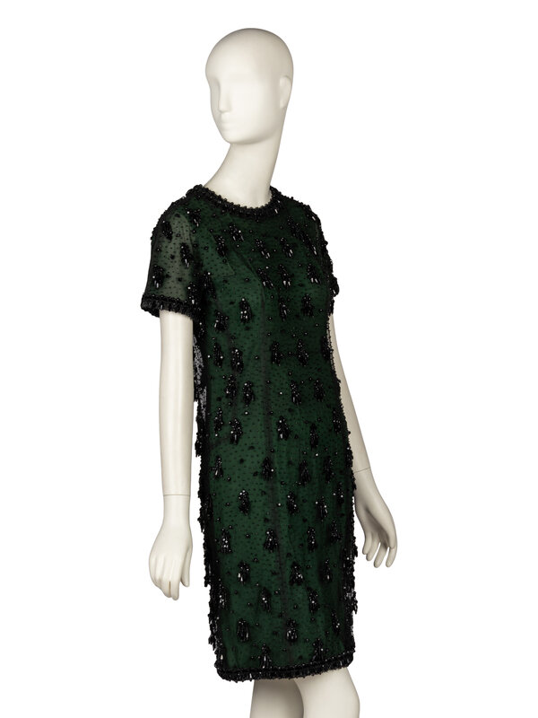 Shift dress in green silk crêpe with a black tulle outer layer; outer layer with all-over black jet beading. Collarless, round neckline. Short sleeves. Above-the-knee length skirt. Woven ribbon & beaded trim at neckline, sleeve hems, and skirt hem. Concealed zipper and hook-and-eye closures at back of green dress; snap closures at back of tulle outer layer. Fully lined in black silk habotai.