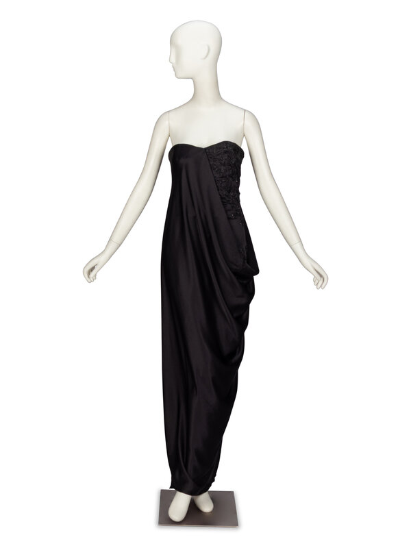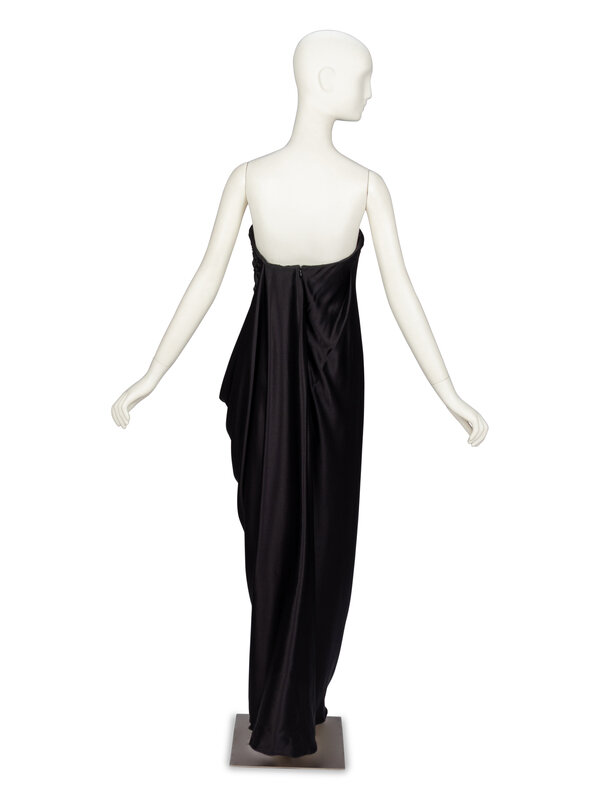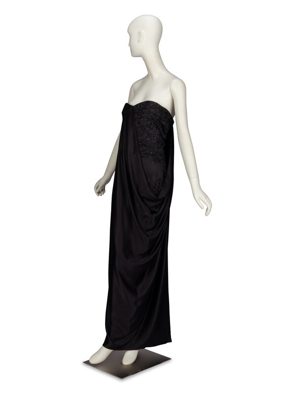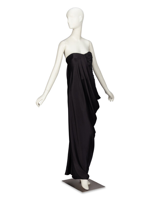 Strapless gown in black silk charmeuse. Sweetheart neckline. Black jet beading & embroidery at one side of bodice. Draped toga-like swag from bust to hip. Boned corselette at interior with zipper closure. Invisible zipper closure at exterior back bodice. Partially lined.