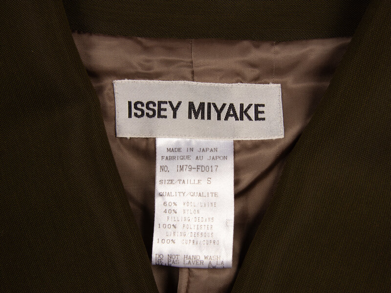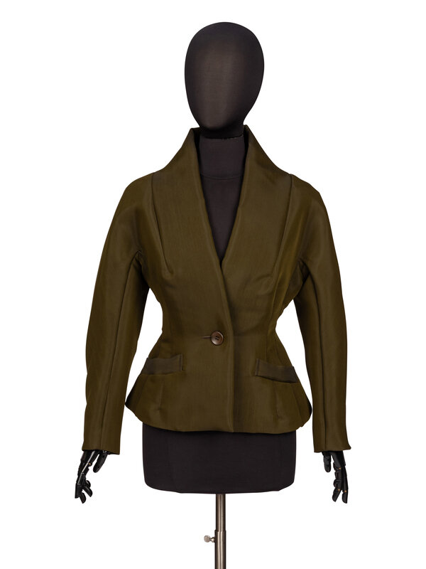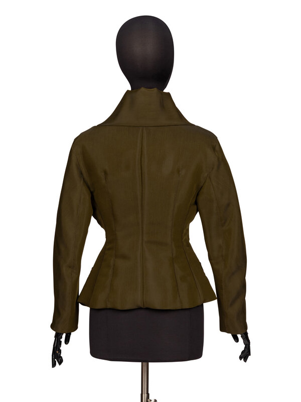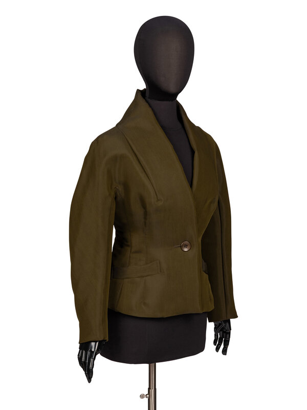 Waisted jacket in olive green wool/nylon-blend satin; slightly padded. V-neckline with built-up collar. Wrist-length incorporated sleeves. Two welt pockets at front. Single button closure at front with two concealed snap closures. Fully lined.