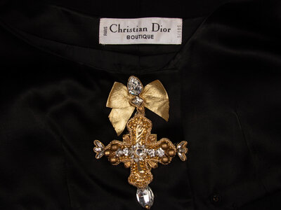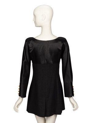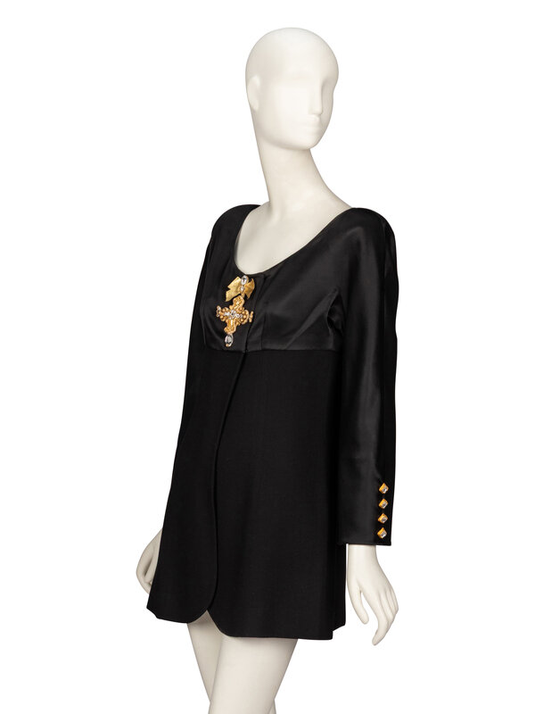 Long evening jacket in black satin and crêpe; with large gold cross embellishment at chest. Wide scoop neckline. Padding at shoulders. Wrist-length incorporated sleeves with rhinestone decorative buttons at sleeve hems. Empire waistline. System of snap & hook-and-eye closures at chest. Fully lined.