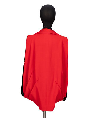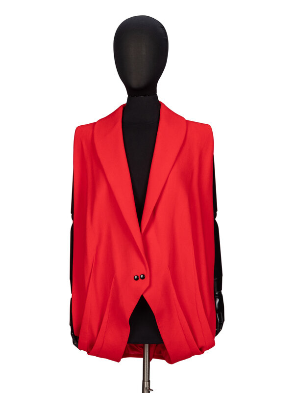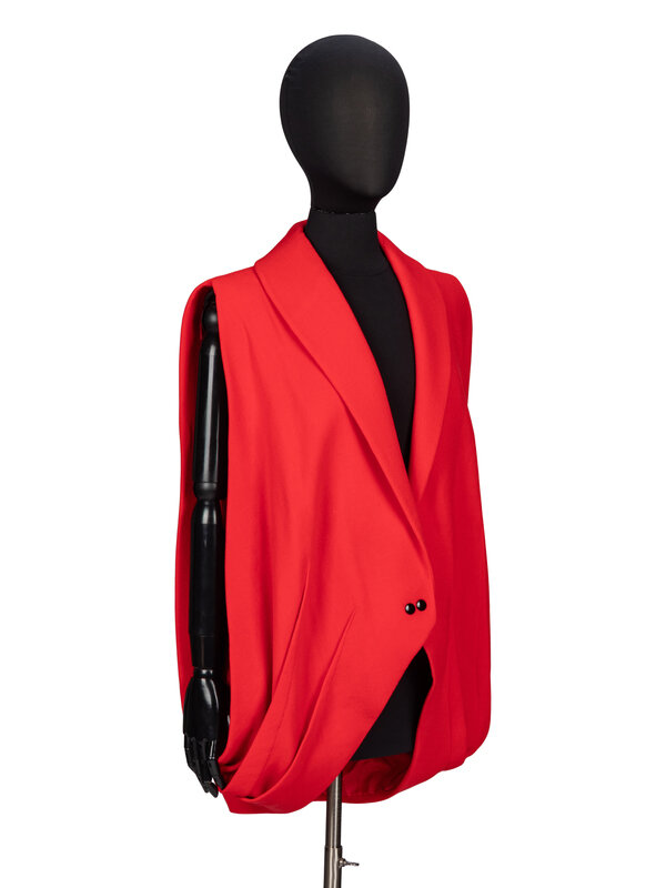 Draped vest in red wool crêpe. Shawl collar. Completely open sides/armholes. Exposed darts at hem. Curved hem with cutaway at front. Two black snap button closures at front. Fully lined in tonal silk habotai.
