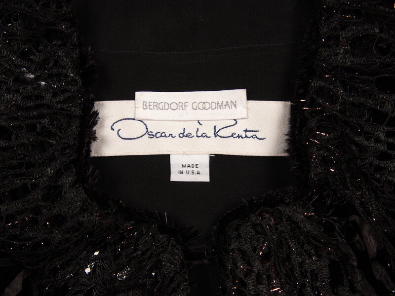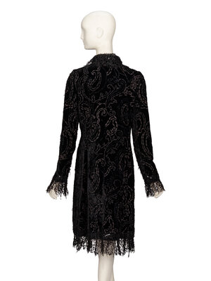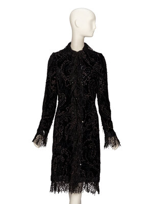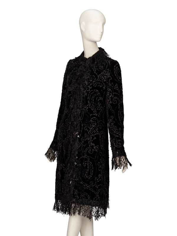 Long evening jacket in black viscose-blend velvet with swirling tonal embroidery throughout; sequin, ostrich feather, and lace trim throughout edges. Stand collar. Full-length set-in sleeves with invisible zipper closures at sleeve hems. Two in-seam welt pockets at front. Several hook-and-eye closures at front. Fully lined.