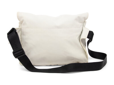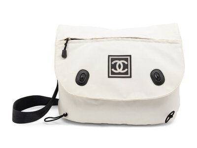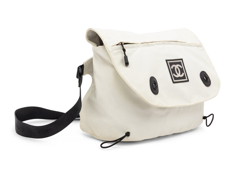 CC Sports Line messenger bag in white nylon with black plastic hardware. Velcro closure and logo-woven adjustable strap.