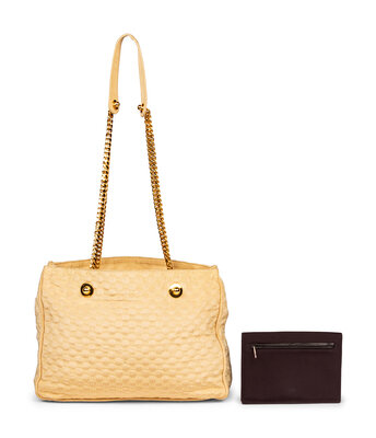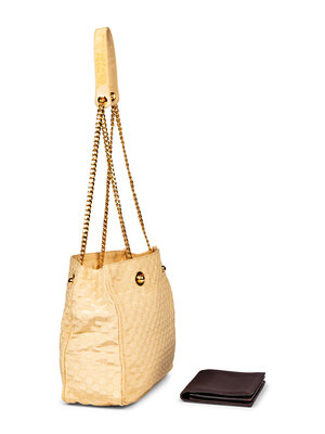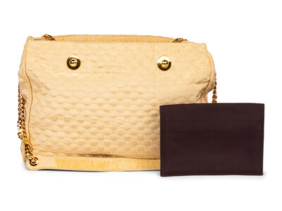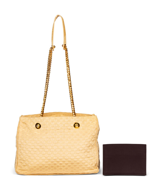 Tote bag in champagne faille with embroidered GG monogram throughout exterior. Magnetic snap closure and gold-tone metal chain and flat faille strap.