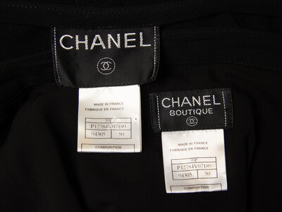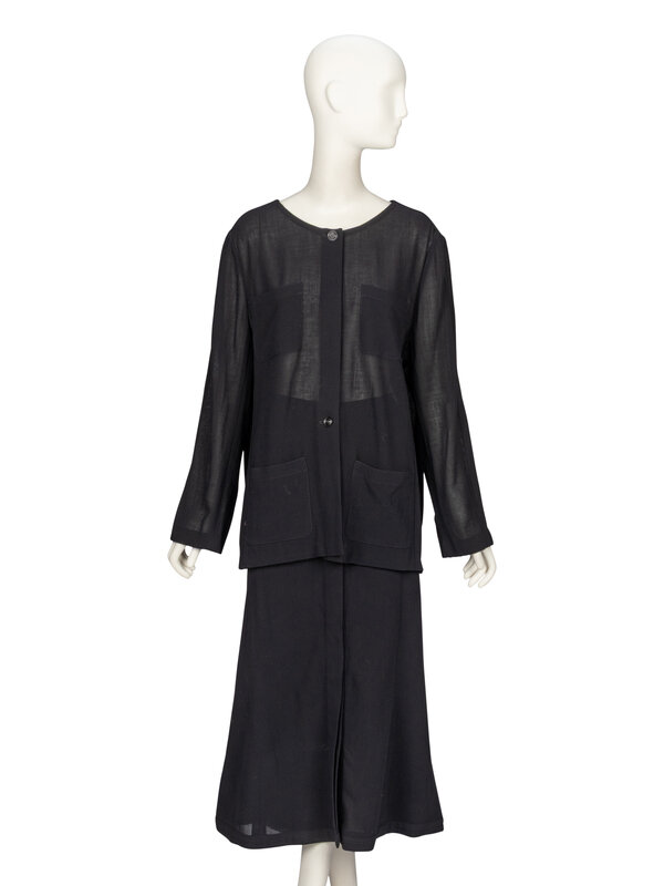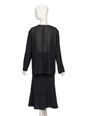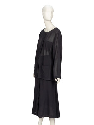 Cardigan jacket in black wool georgette. Wide, round neckline. Topstitched self-fabric strip appliqués throughout. Full-length sleeves. Four patch pockets at front. Metal chain weight at interior hem. Button closures at front; partially concealed. Unlined.