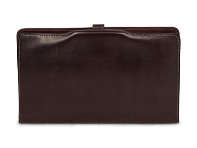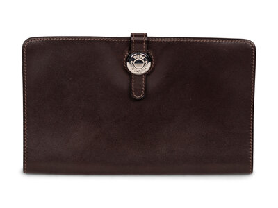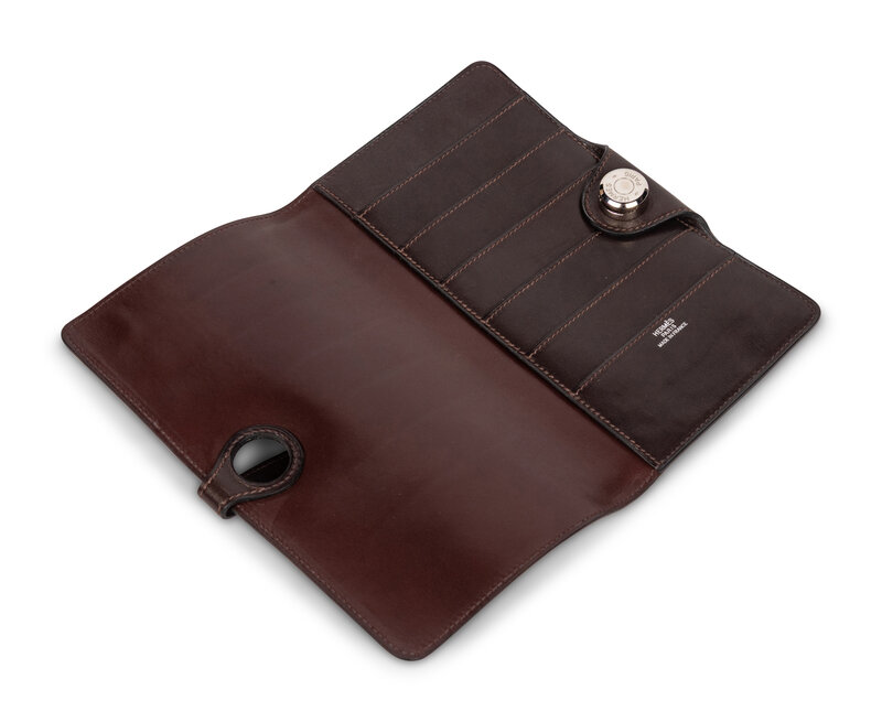 Dogon wallet in deep brown Swift leather with palladium-plated Clou de Selle closure.