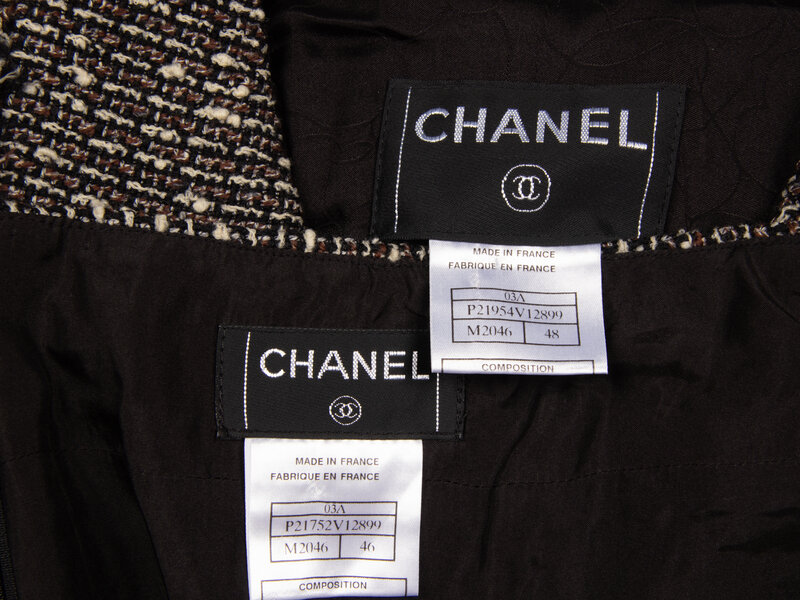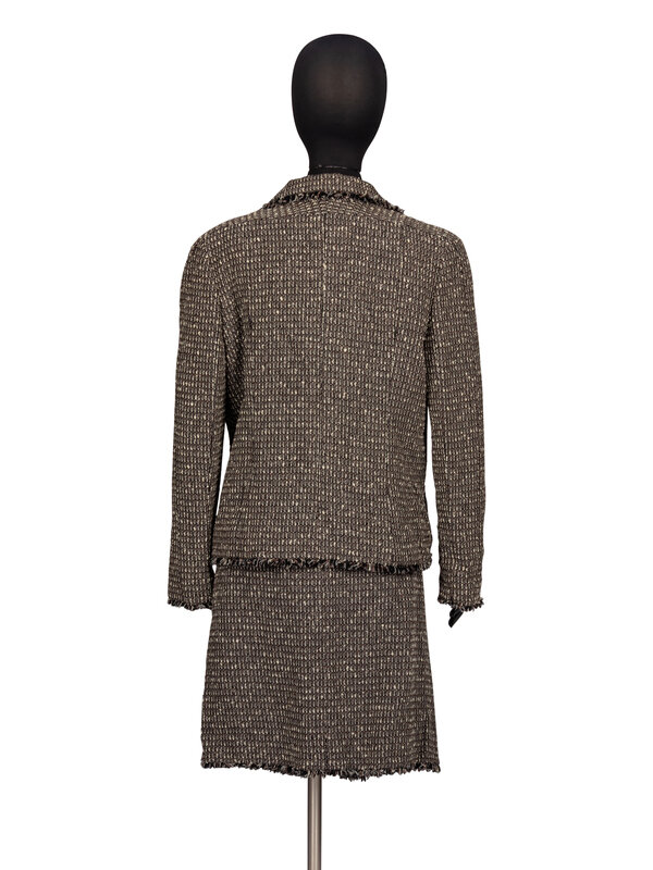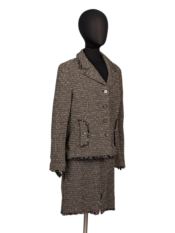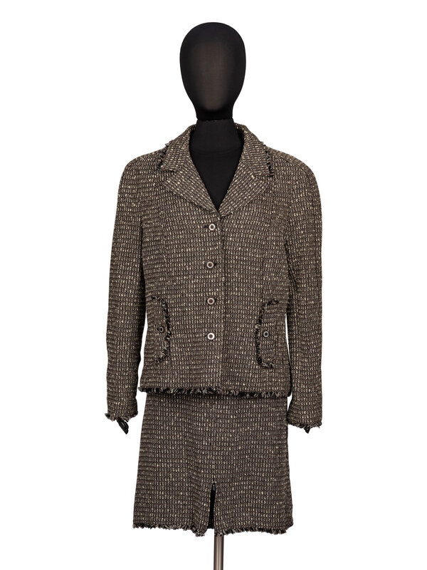 Lightly tailored jacket in brown-ish wool-blend bouclé tweed. Frayed trim throughout edges. Notched lapels. Padding at shoulders. Full-length set-in sleeves. Two welt pockets with decorative buttoned flaps at front. Metal chain at interior hem. Button closures at front. Fully lined.