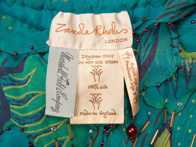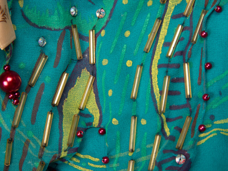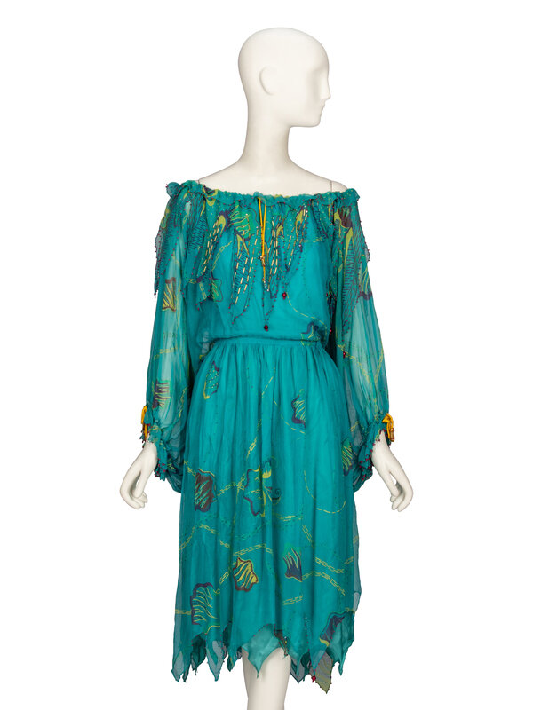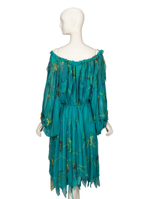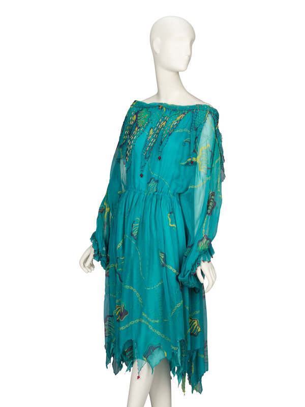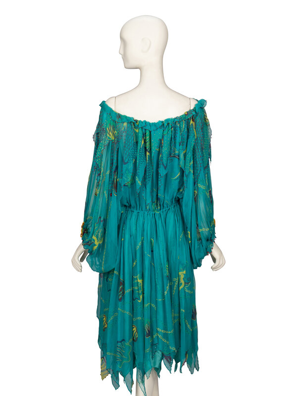 Knee-length dress in teal silk chiffon with multicolor hand-painted designs & bead embellishments throughout. Wide, round gathered neckline with drawstring cord and jester collar. Full-length dolman sleeves with drawstring gathered cuffs. Elasticated waist. Gathered skirt with inverted-scalloped hemline. Bead embellishments at edges throughout. Fully lined.