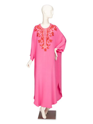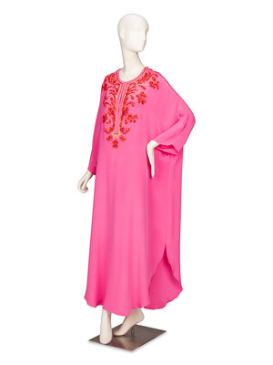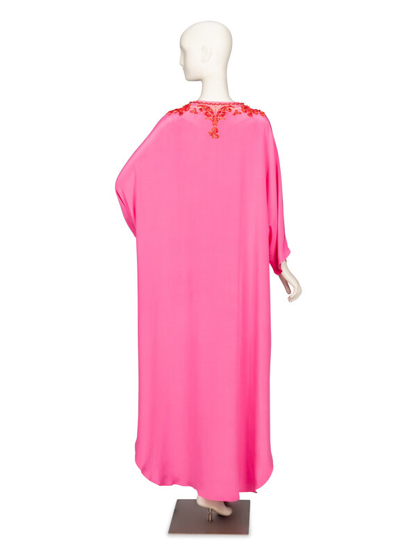 Full-length kaftan in bubblegum pink silk crêpe de chine; with red bead & metallic gold embroidery embellishments around neckline and chest. Round neckline with slit opening at chest. Elbow-length kimono-style dolman sleeves. Rounded hemline. Three hook-and-eye closures at chest. Unlined.