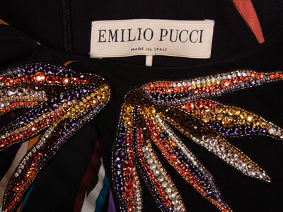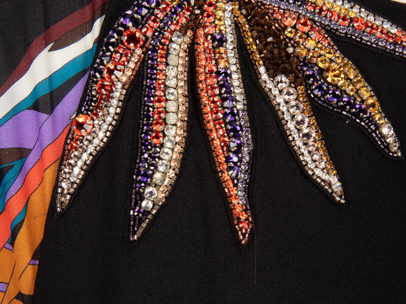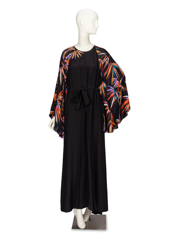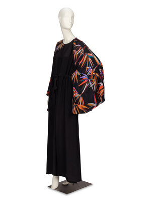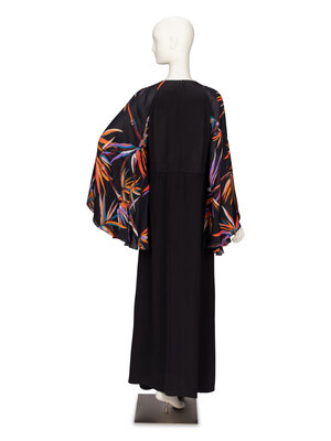 Evening dress in black stretch-blend silk crêpe de chine and multicolor printed silk chiffon. Multicolor bead & rhinestone embellishments at right shoulder. Round neckline. Full-length dolman flutter sleeves. Self-fabric drawstring ties at waist. Full-length layered skirt. Invisible zipper closure at back. Partially lined.