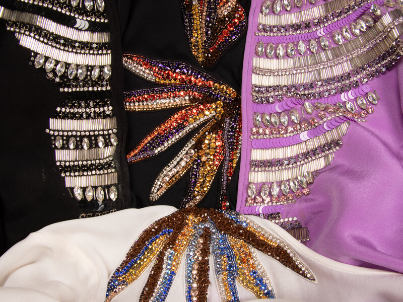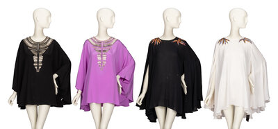 Kaftan-style blouse in lilac silk crêpe de chine. Round neckline with slit opening at front. Rhinestone & bead embellishments at neckline and front. Three-quarter-length dolman sleeves. Two hook-and-eye closures at front. Unlined.
