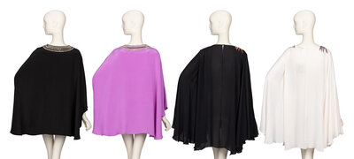 Kaftan-style blouse in black silk crêpe de chine. Round neckline with slit opening at front. Rhinestone & bead embellishments at neckline and front. Three-quarter-length dolman sleeves. Two hook-and-eye closures at front. Unlined.