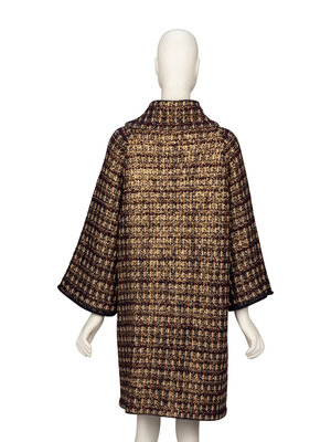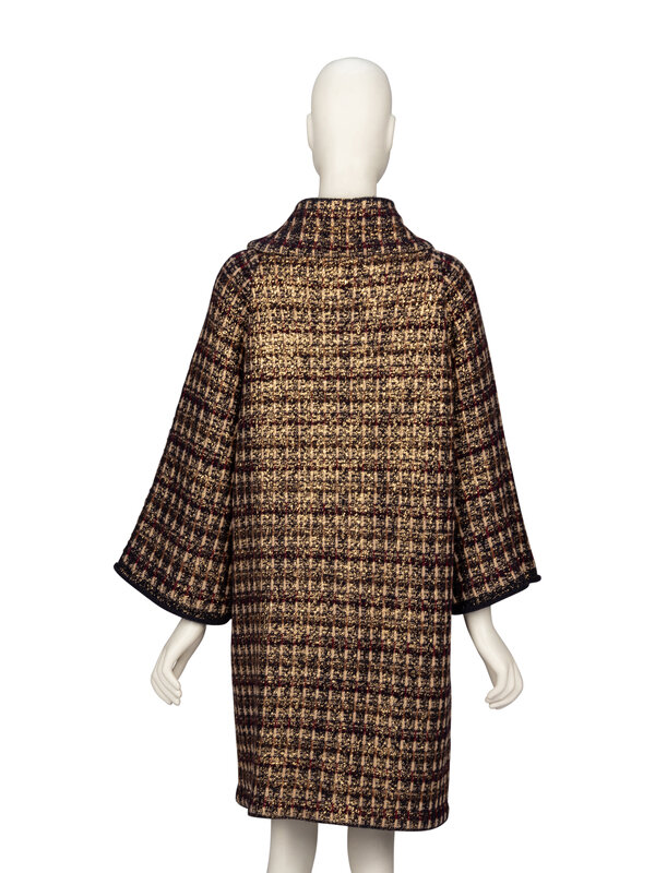 Duster cardigan jacket in multicolor wool/cashmere-blend knit tweed; features metallic gold paint flecks throughout exterior surface. Wide stand collar. Wrist-length wide raglan sleeves. Four patch pockets at front. Large open-work gold-tone metal square buttons at front with inset stones; snap closures at front. Unlined.