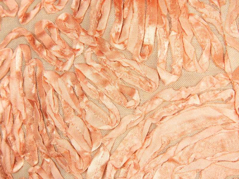 Popover blouse in a textural peach silk satin-appliquéd textile. Spread collar with half-length opening at front. Full-length incorporated sleeves. Self-fabric knot button closures at front. Fully lined.