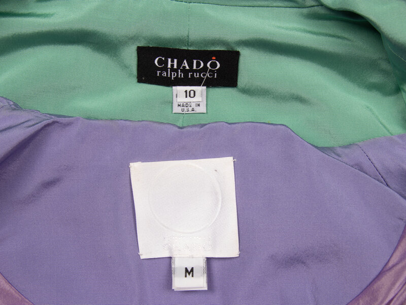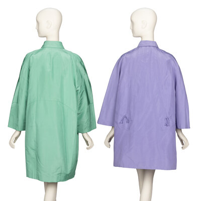 Knee-length coat in lavender silk faille. Decorative piecing and topstitching throughout. Spread collar. Incorporated above-wrist-length sleeves. Two welt pockets at front. Self-fabric knot button closures at front. Fully lined.