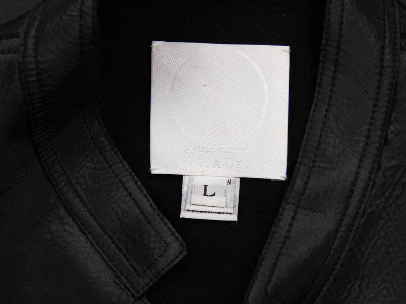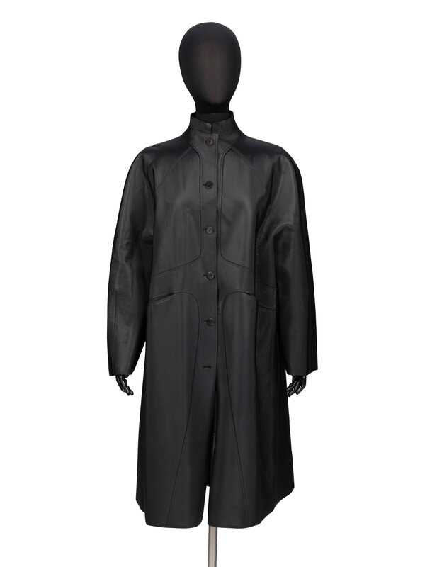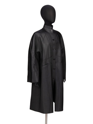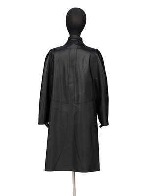 Knee-length coat in black nylon-bonded cashmere felt. Built-up stand collar. Full-length incorporated sleeves. Two welt pockets at front. Decorative piecing throughout. Button closures at front. Lined in cashmere.
