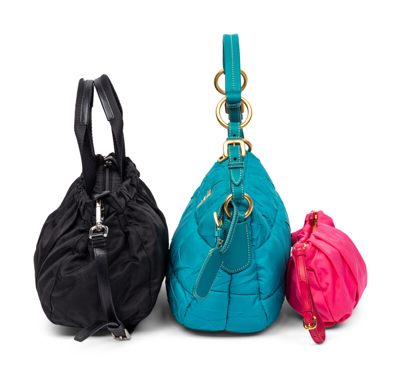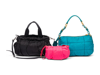 Handbag in black nylon with black leather trim. Zipper closure. Woven nylon & leather handles and removable flat leather strap.