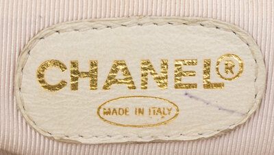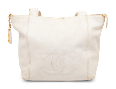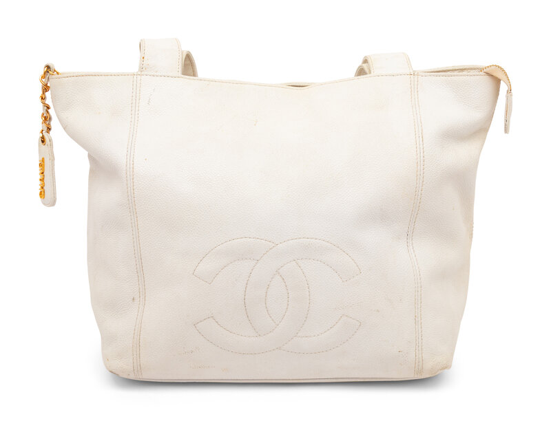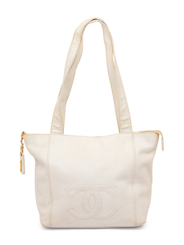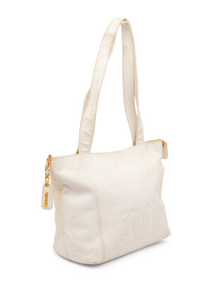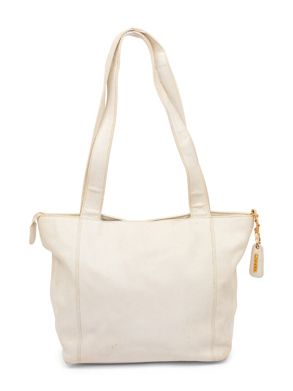 Tote bag in white caviar leather with CC logo topstitching. Zipper closure and flat leather straps.