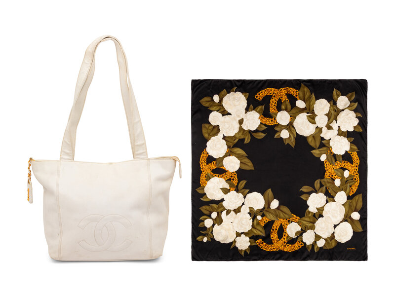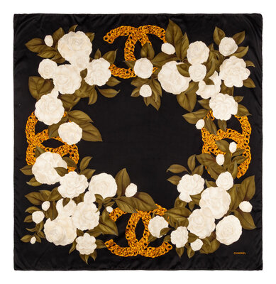 Multicolor printed scarf with camellias and chain CC's on silk charmeuse. Hand-rolled & stitched edges.