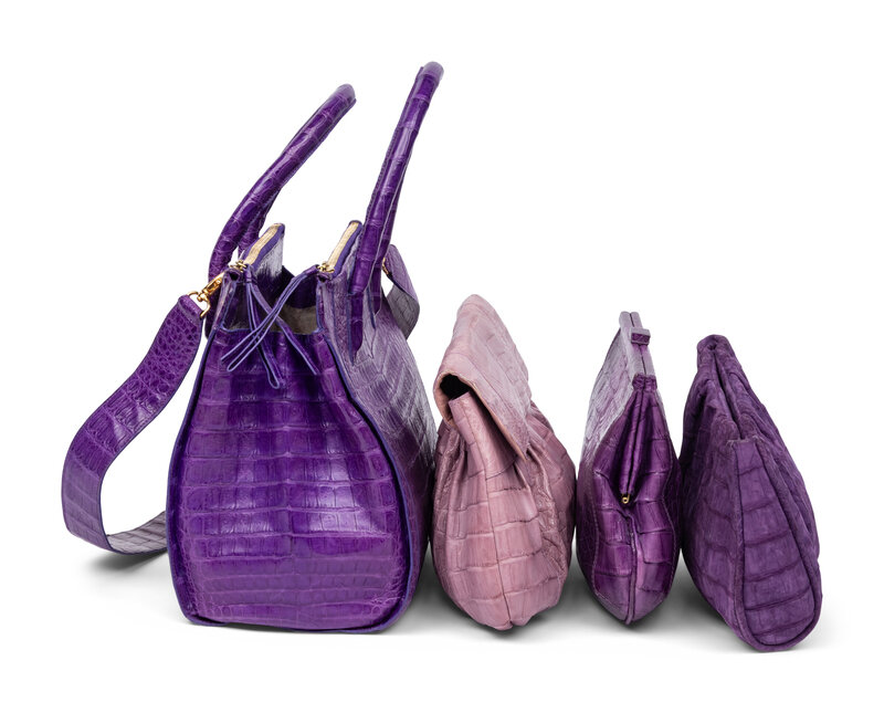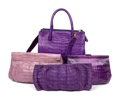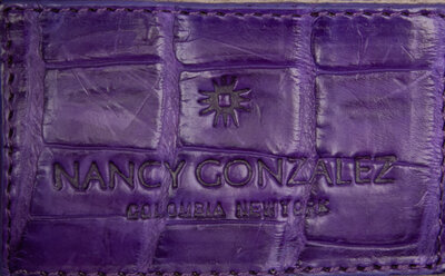 Handbag in royal purple crocodile skin. Magnetic snap and zipper closures. Rolled handles and removable crocodile shoulder strap.