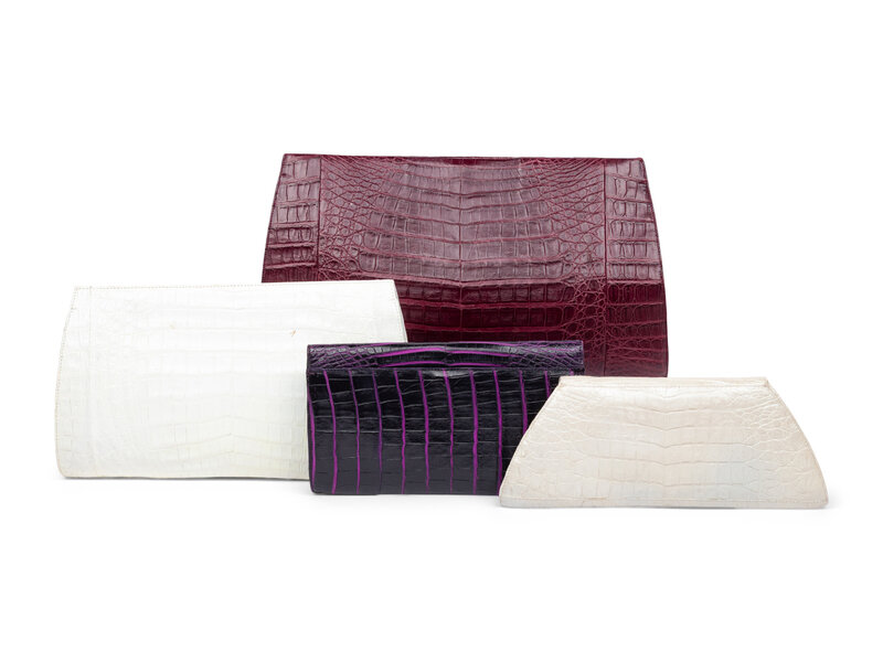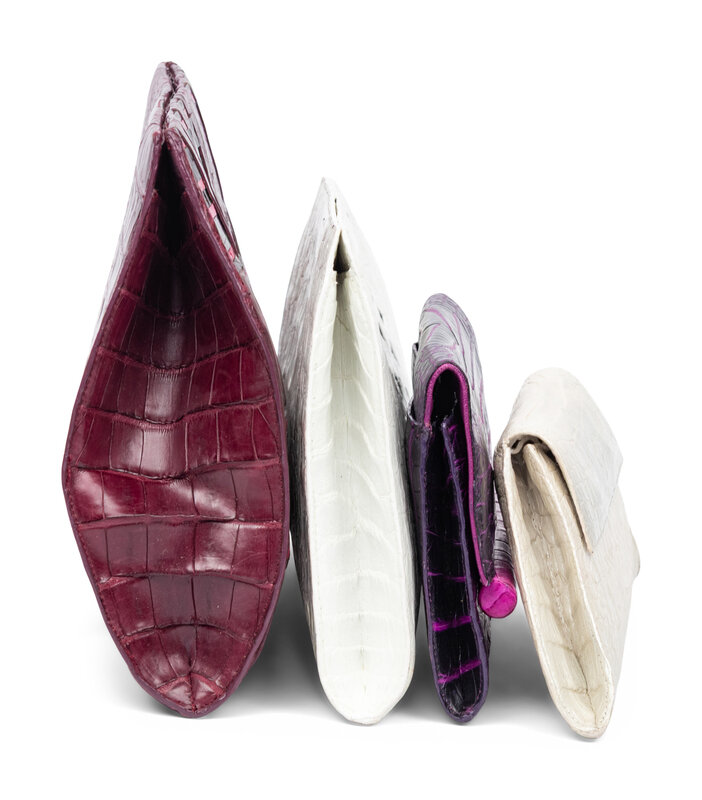 Clutch in black, purple, and magenta crocodile skin. Magnetic snap closures to flap.