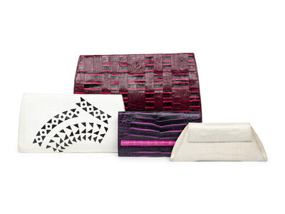 Clutch in white crocodile skin with geometric black python skin insets at front. Magnetic snap closures.