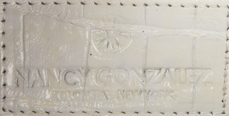 Clutch in pearlescent grey-white crocodile skin. Magnetic snap closure and removable crocodile skin handle.