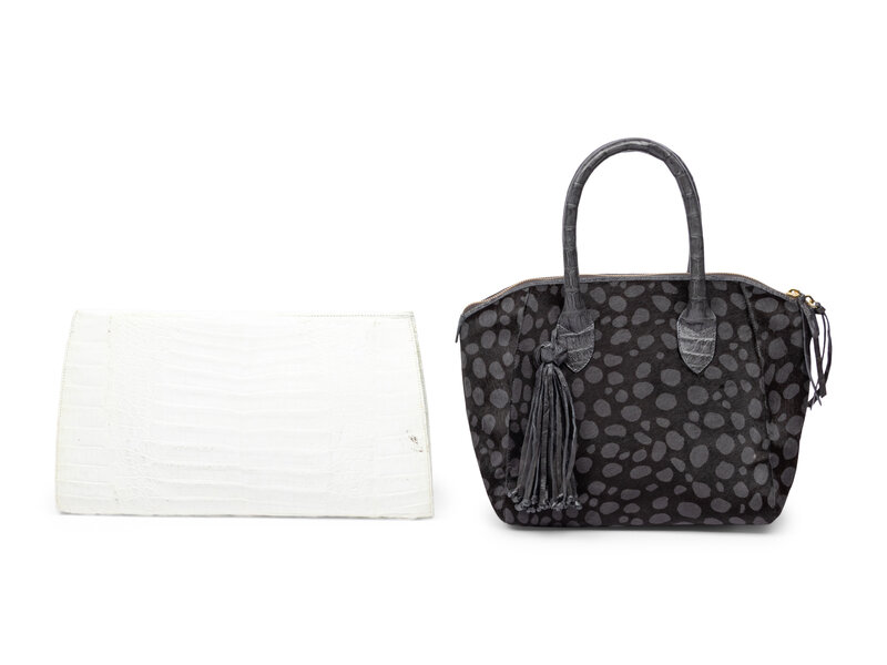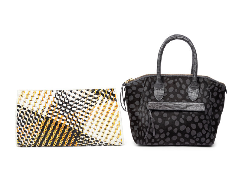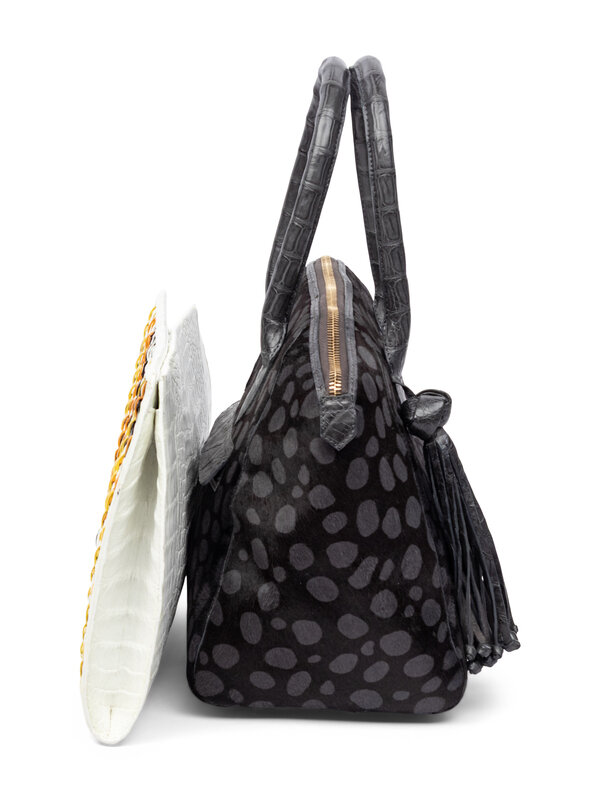 Handbag in black & grey dotted pony hair with grey crocodile skin. Double-ended zipper closure and rolled crocodile skin handles.