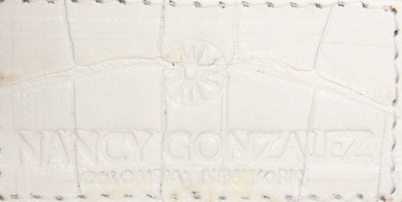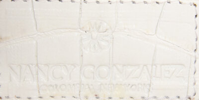 Clutch in white crocodile skin with a multicolor woven crocodile skin panel at front. Magnetic snap closure.