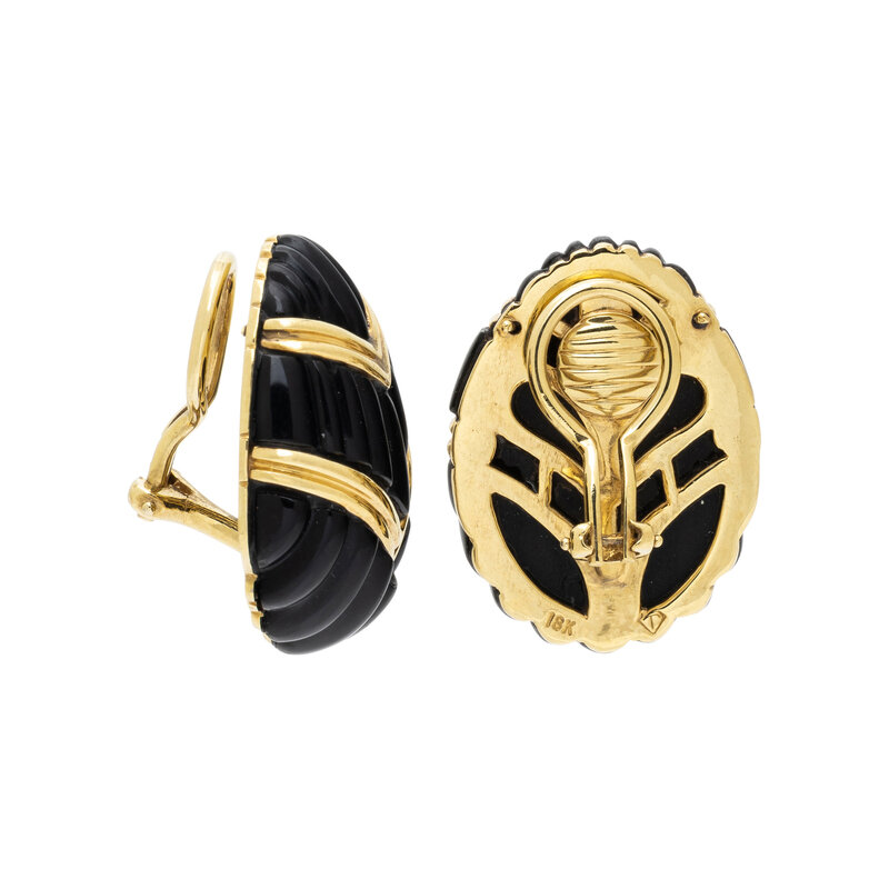 Carved black onyx. 18 karat yellow gold. 1 1/8 x 3/4 inches.
