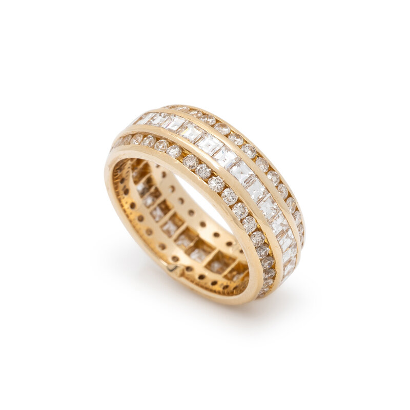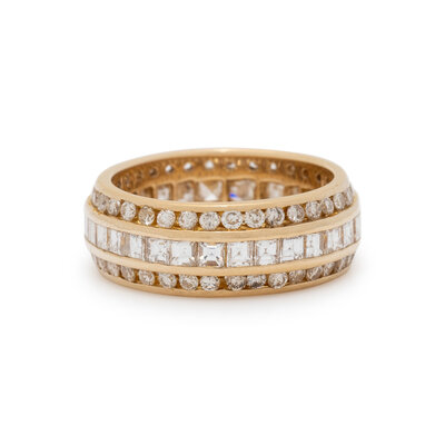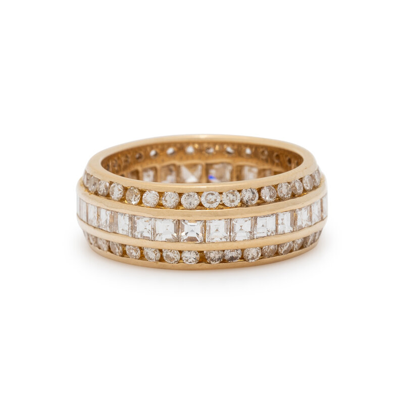 Round and square cut diamonds weighing approximately 2.65 carats total. Yellow gold. Ring size 6.