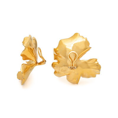 Bright finish golden aluminum with 18k yellow gold clip backs. 2 inches long.