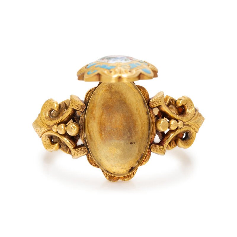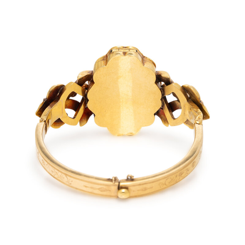 Featuring a locket centerpiece set with polychrome enamel in a floral design, double hinged with clasp at the back. Mounted in yellow gold. 6 1/2 inches inner circumference.