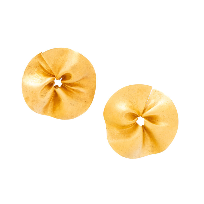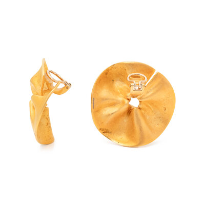 Sculpted matte gold toned aluminum with 18 karat gold clip backs. 2 inches long.