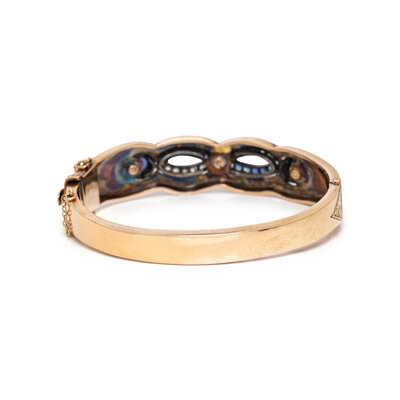 Round sapphires, old European cut diamonds, and blue enamel, hinged with side clasp. Yellow gold and silver. 6 3/8 inches inner circumference.